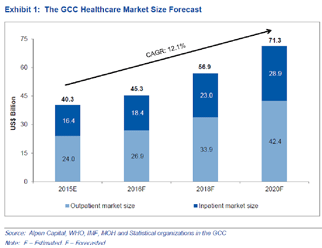 According to Alpen Capital, the GCC healthcare market is projected to grow at a 12.1% CAGR from an estimated US$ 40.3 billion in 2015 to US$ 71.3 billion in 2020 (Exhibit 1). An increase in the population and rising cost of treatment are the primary factors aiding this growth.