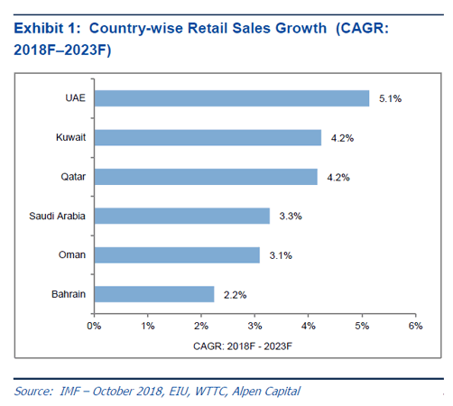 “The GCC retail industry has witnessed challenging times in recent years but the long-term fundamentals of the sector remain intact. Alpen Capital anticipates that the GCC retail sector is likely to regain momentum, owing to strong fundamentals that include an expanding population base, high GDP per capita and growing tourism in the region. Economic recovery led by improving oil prices is expected to revive consumer confidence and improve discretionary spending. Initiatives taken by the GCC governments to stimulate retail infrastructure projects and ease business and visa regulations should provide further impetus to the retail sector”, says Sameena Ahmad, Managing Director, Alpen Capital (ME) Limited.