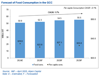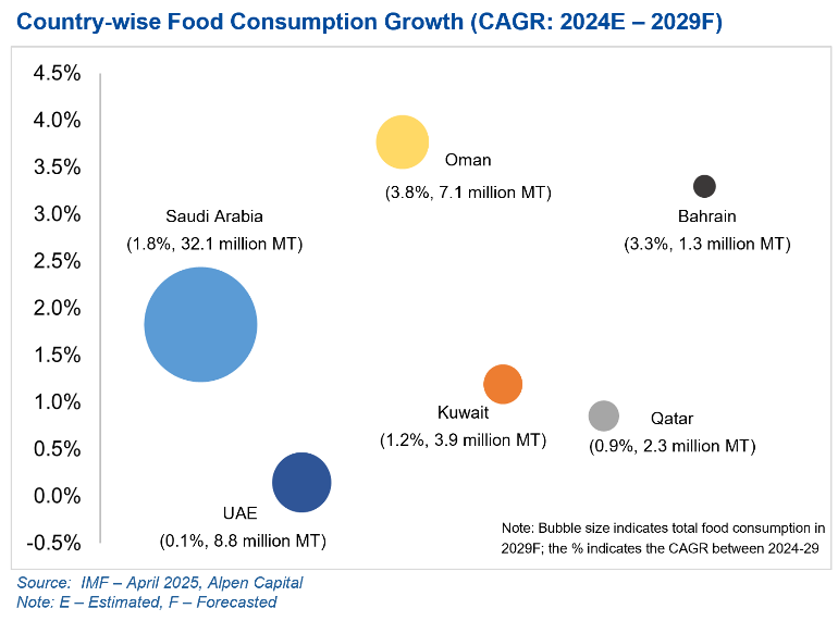 According to Alpen Capital, food consumption in the GCC is projected to grow at a CAGR of 1.7% to reach 55.5 million MT by 2029 from an estimated 50.9 million MT in 2024. This growth is expected to be driven by an increasing population, high per capita incomes and rising tourism. Additionally, the heavy investments being made by the regional governments to strengthen food security is likely to support a sustainable supply of food items to meet the rising demand.