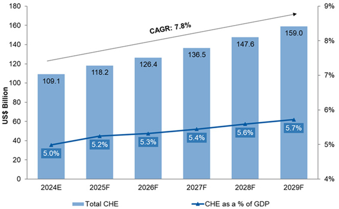 According to Alpen Capital, CHE in the GCC is expected to grow from an estimated US$ 109.1 billion in 2024 to US$ 159 billion in 2029, at a CAGR of 7.8%. The region’s expanding population base, high incidence of NCDs, rising cost of treatment and medical inflation, coupled with increasing penetration of health insurance are expected to drive growth.