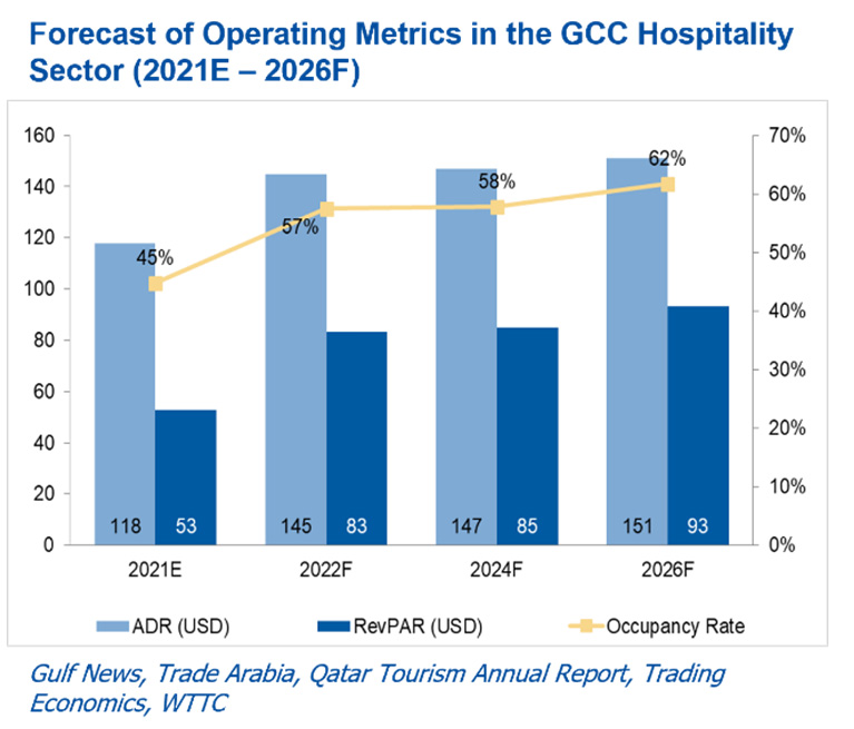 After witnessing a significant increase this year, the hospitality operating metrics are likely to witness steady growth going forward. Average occupancy rate across the GCC is forecasted to rise from 57% in 2022 to 62% in 2026. The Average Daily Rate is forecasted to increase from USD 145 this year to USD 151 in 2026, whilst Revenue Per Available Room is expected to increase from USD 83 to USD 93 representing an annualized growth rate of 1.1% and 2.9%, respectively.