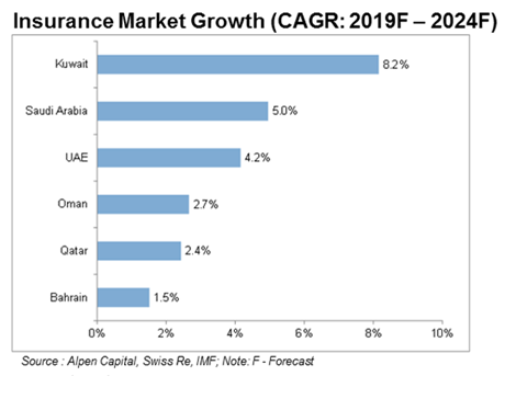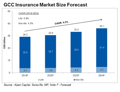 “The GCC insurance industry which maintained a positive momentum over the years, witnessed a slowdown in GWP’s due to sluggish economic conditions during 2016 and 2018. However, going forward, we anticipate the GCC insurance sector to grow at a moderate pace owing to economic revival, growing population, strengthening regulatory reforms and continued implementation of mandatory insurance coverage. Infrastructure development, in line with upcoming mega events, are expected to further aid growth in the segment.” says Sameena Ahmad, Managing Director, Alpen Capital (ME) Limited.
