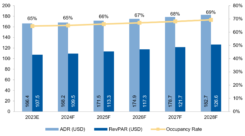 Given the projected growth of the GCC’s hospitality sector, its three key operating metrics – Occupancy Rate, Average Daily Rate (ADR) and Revenue Per Available Room (RevPAR) – are expected to improve over the next five years. The occupancy rate in the GCC is estimated to rise consistently due to increasing tourist arrivals. It is forecasted to grow from 64.6% in 2023 to 69.3% in 2028. ADR is expected to increase at a CAGR of 1.9% during the same period, from USD$ 166.4 to US$ 182.7, whereas RevPAR is forecasted to grow at a CAGR of 3.3% from US$ 107.5 in 2023 to US$ 126.6 in 2028