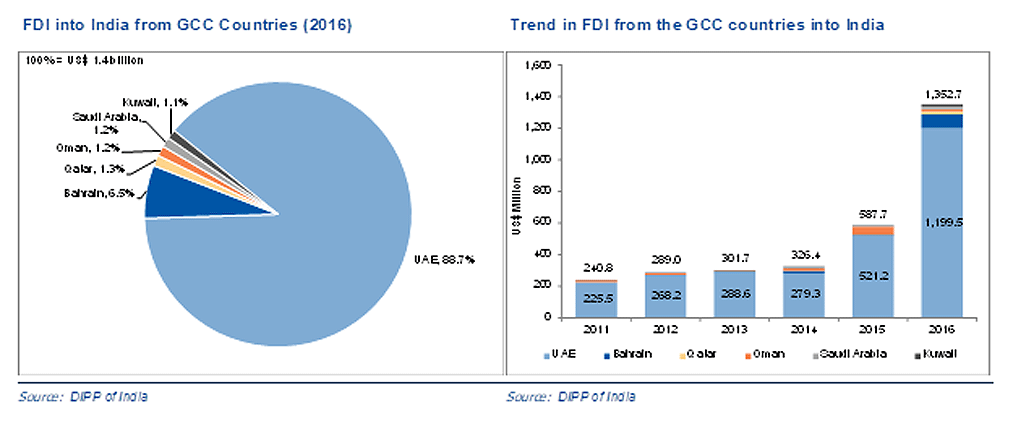 In contrast to the overall decline in total FDI into the GCC, investments from India grew at a CAGR of 15.9% from US$ 1.4 billion in 2011 to US$ 2.9 billion in 20161. During the period, India’s share of the total investments into the GCC increased substantially from 4.7% to 16.2%.