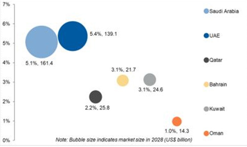 Retail sales in Kuwait and Bahrain are projected to witness a CAGR of 3.1% each between 2023 to 2028, whereas Qatar and Oman are expected to grow at a CAGR of 2.2% and 1.0%, respectively.