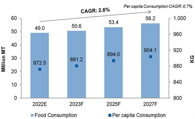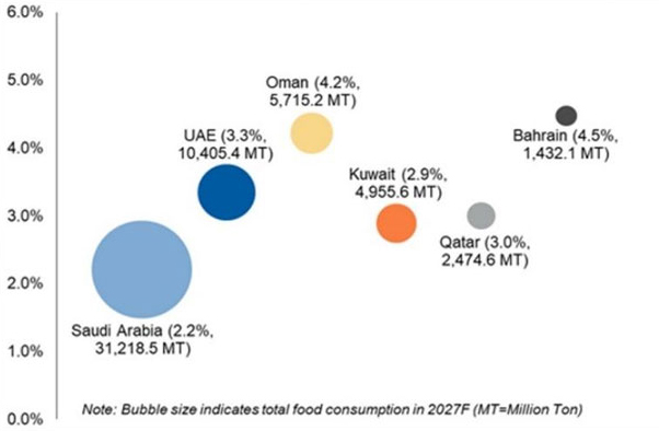According to Alpen Capital food consumption in the GCC is projected to grow at a CAGR of 2.8% to reach 56.2 million MT by 2027 from an estimated 49.0 million MT in 2022. Future growth is expected to be driven by an increase in population, rise in per capita income, and rebound in tourism activities. The regional governments are also taking several initiatives towards ensuring a sustainable supply of food items to meet the rising demand. Moreover, growing awareness of healthy eating habits coupled with increasing penetration of the food services sector offering global cuisines are likely to aid the food consumption across the GCC over the next five years. The per capita consumption in the GCC is forecasted to reach 904.1 kg by 2027 from an estimated 872.5 kg in 2022, growing at a CAGR of 0.7%