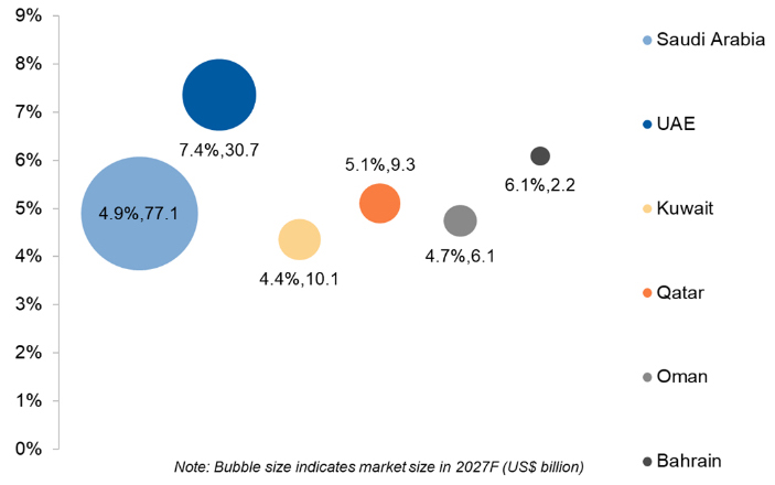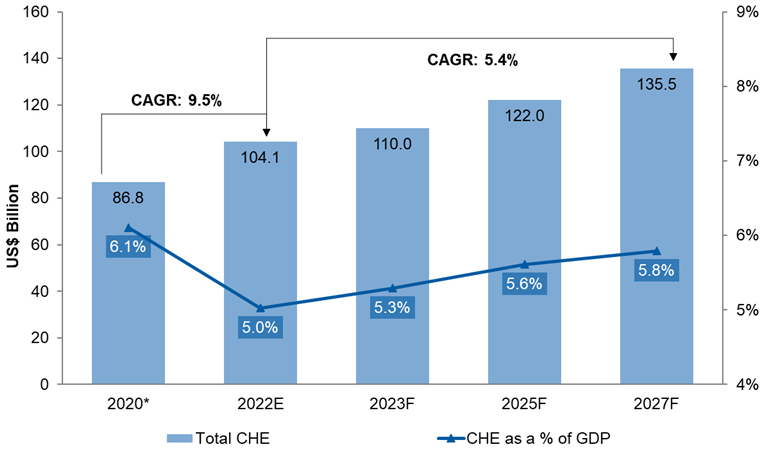UAE is likely to witness the highest growth rate of 7.4% compared to its GCC peers in anticipation of a fast-growing population, increased and wider coverage of mandatory health insurance and high medical inflation rate. The market rankings are expected to remain unchanged, with Saudi Arabia and the UAE dominating the region’s CHE with a combined share of 79.6% in 2027.