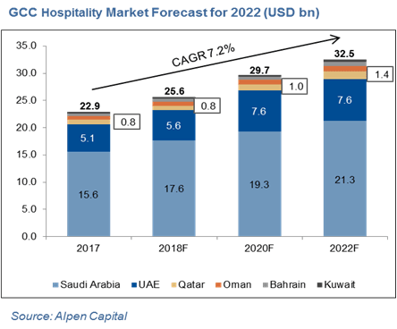 According to Alpen Capital, the GCC hospitality market is expected to grow at a 7.2% CAGR from an estimated US$ 22.9 billion in 2017 to US$ 32.5 billion in 2022. Upcoming mega events and government initiatives to boost tourism are the primary drivers behind this growth.