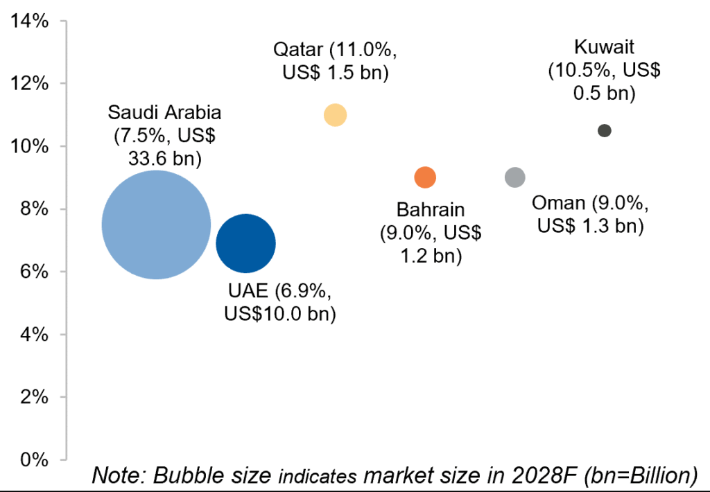 The growth in the hospitality sector revenue of individual GCC countries is expected to range from a CAGR of 6.9% to 11.0% between 2023 and 2028. Saudi Arabia is projected to grow in line with the GCC average of 7.5%, supported by numerous government-led initiatives as part of its Vision 2030, whereas the UAE is expected to grow at a CAGR of 6.9%, backed by the government’s focus on modernizing infrastructure and easing tourist visa rules. Smaller markets are expected to witness high growth rates during the forecast period, with Qatar at 11.0%, Kuwait at 10.5% and, Oman and Bahrain at 9.0% CAGR.