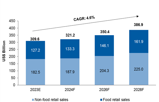 Non-food retail sales are anticipated to grow at a CAGR of 4.3%, while food retail sales are expected to rise at a pace of 5.0% CAGR between 2023 and 2028 in the GCC
