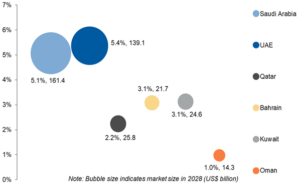 Retail sales in Kuwait and Bahrain are projected to witness a CAGR of 3.1% each between 2023 to 2028, whereas Qatar and Oman are expected to grow at a CAGR of 2.2% and 1.0%, respectively.